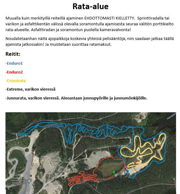 Näin keväällä muistutukseksi kaikille radan käyttäjille sallituista ajopaikoista. Muualla kuin merkityillä reiteillä ajaminen EHDOTTOMASTI KIELLETTY. Sprinttiradalla tai varikon ja asfalttikentän välissä olevalla soramontulla ajamisesta seuraa välitön porttikielto rata-alueelle. Asfalttiradan ja soramontun puolella kameravalvonta! Noudatetaanhan näitä ajopaikkaa koskevia yhteisiä pelisääntöjä, niin saadaan jatkaa täällä ajamista jatkossakin! Ja muistetaan suorittaa ratamaksut. Kuvassa näkyy sallitut reitit, reittien merkkausta […]